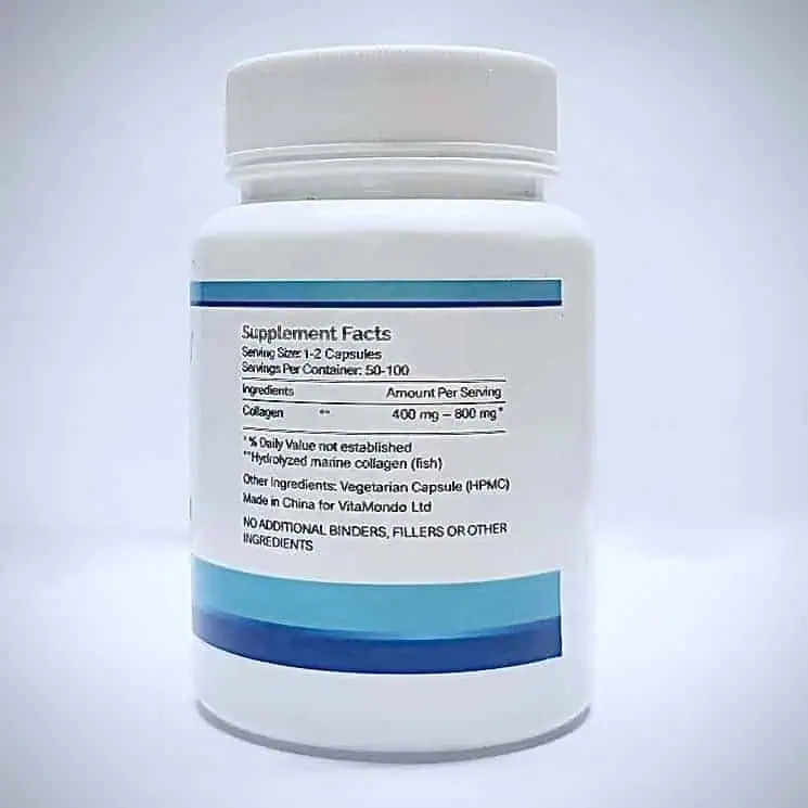 Hydrolyzed Marine Collagen 98% Peptide. Made from fresh fish scale. One capsule contains 400 mg collagen. Vegetarian cellulose capsule.