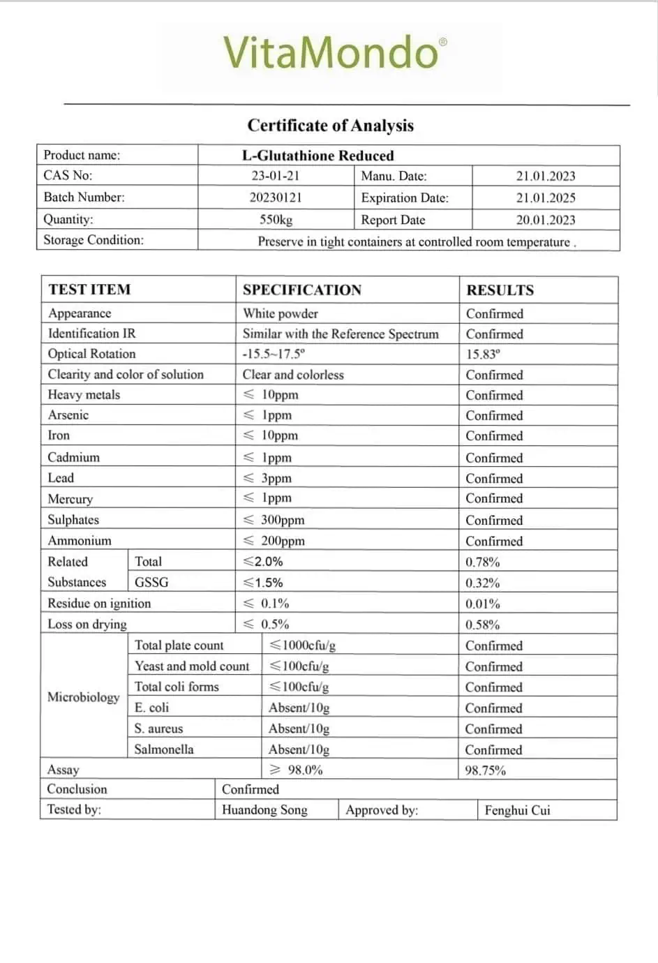L-Glutathione (Reduced Form) 98% (GSH). 400 mg per capsule (capsule weight: 500 mg). Vegetarian cellulose capsule. No fillers or additives.