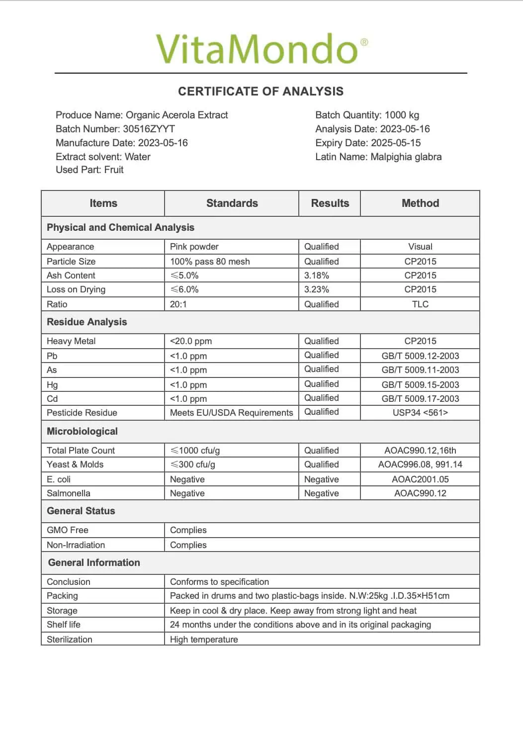 Organic Acerola Cherry Extract Powder (Malpighia emarginata). 20:1 extract. Contains no added fillers or excipients.