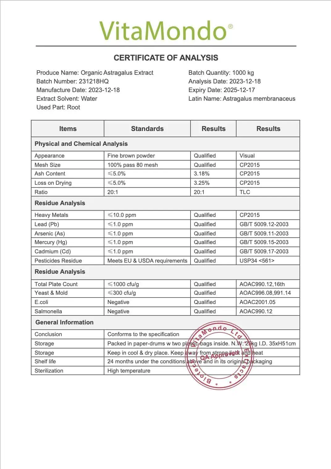 Organic Astragalus Root Extract 20:1 (Astragalus membranaceus), produced via distilled water extraction. Vegetarian capsule (cellulose). Capsule weight: 500 mg. No added ingredients.