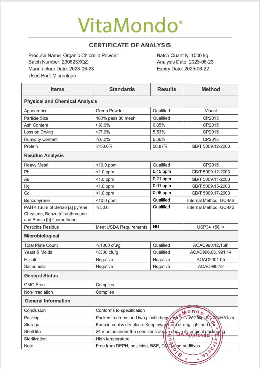 100% Organic Chlorella Powder (C. vulgaris). Cell walls fractured for improved nutrient absorption.