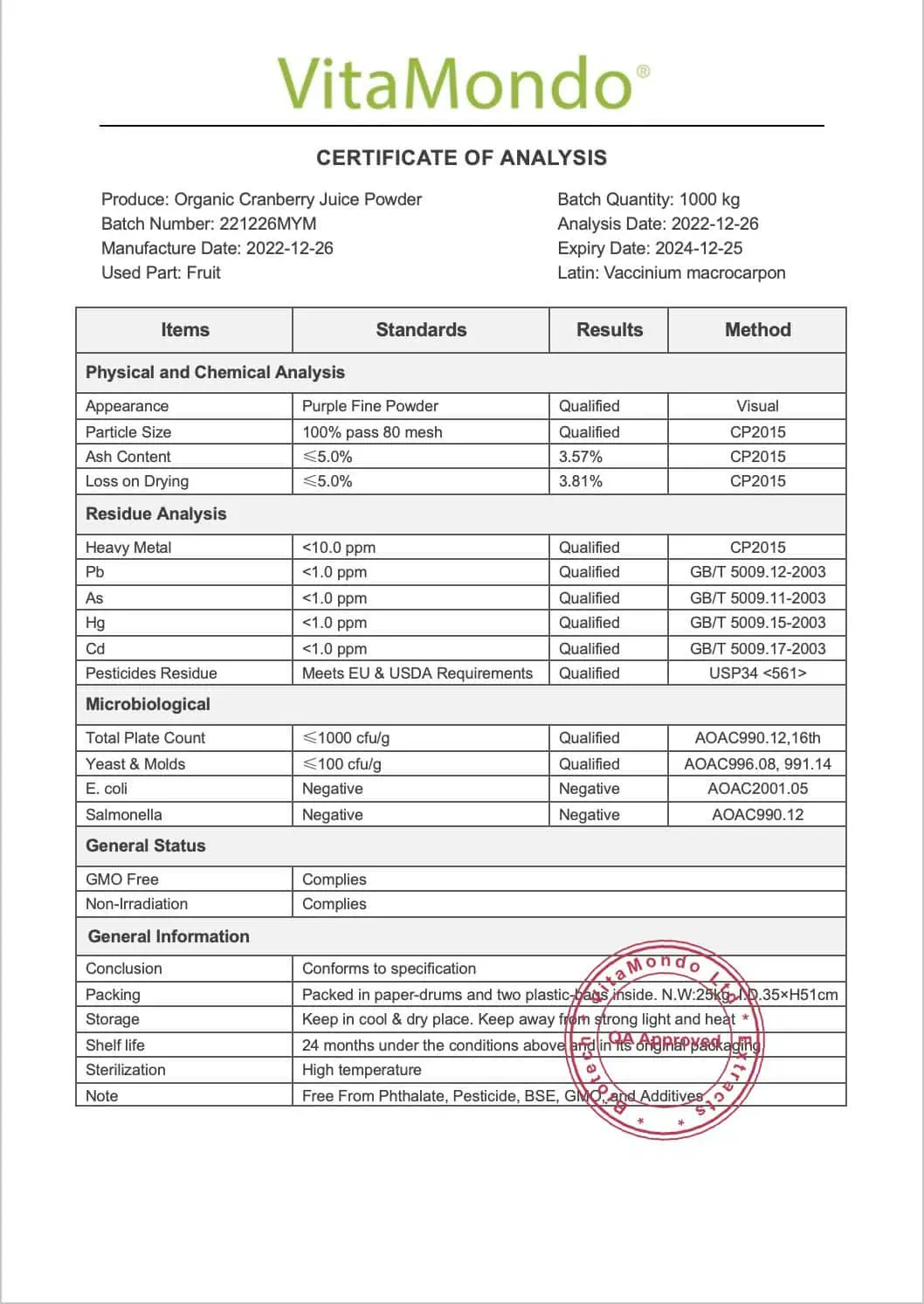 Organic Cranberry Juice Powder (Vaccinium oxycoccos). Spray-dried. No added fillers.