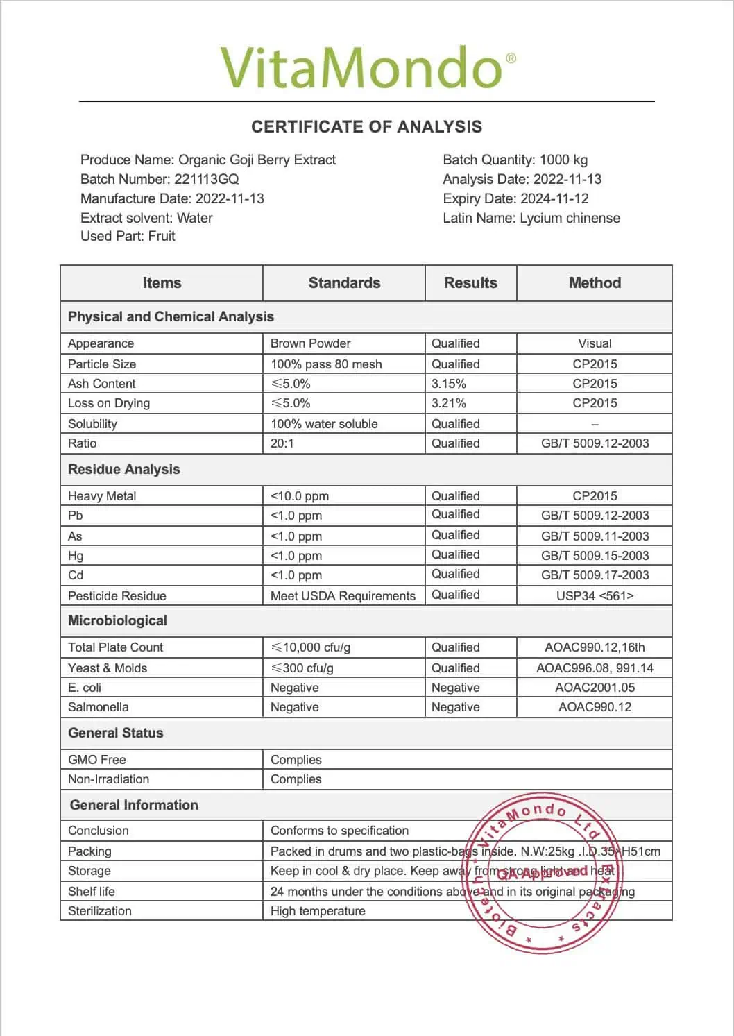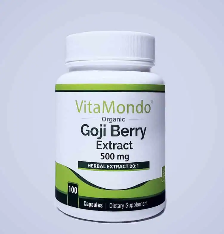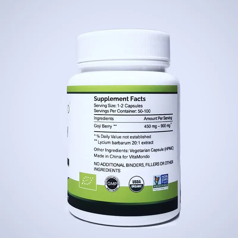 Organic Goji Berry Extract (Lycium barbarum). 20× water extract. Vegetarian cellulose capsules. No fillers.