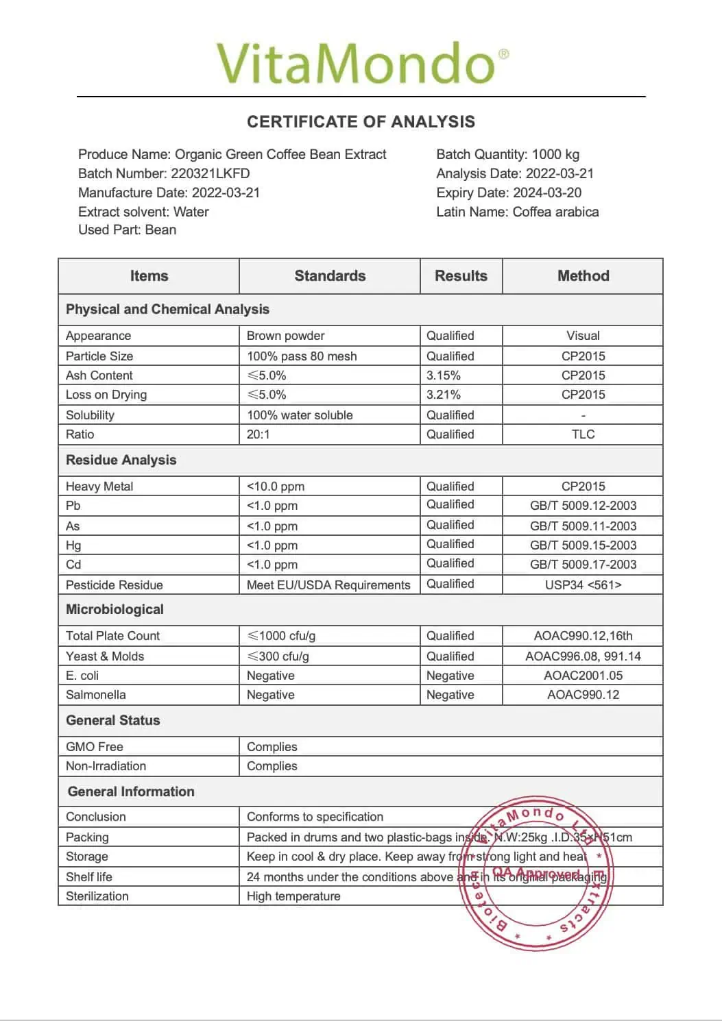 Organic Green Coffee Bean Extract containing ~24% Chlorogenic Acid (CGA). Made from Coffea arabica (green coffee beans). No fillers or additives.