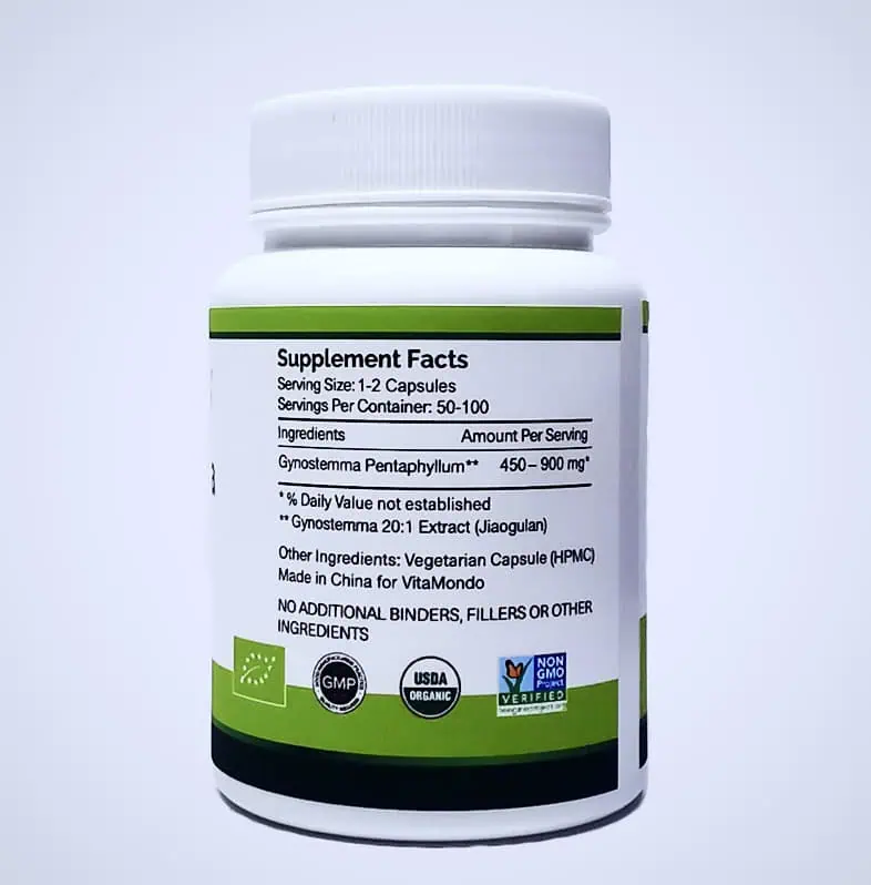 Organic Gynostemma Pentaphyllum Extract. 20:1 concentration. Vegetarian capsules made from cellulose. Capsule weight: 500 mg.