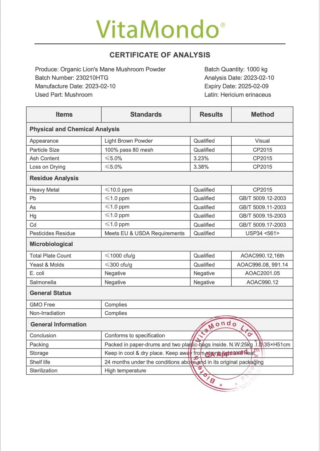 Organic Lion’s Mane Mushroom Powder (Hericium erinaceus). 100% pure, unextracted, dried powder. No fillers or additives.