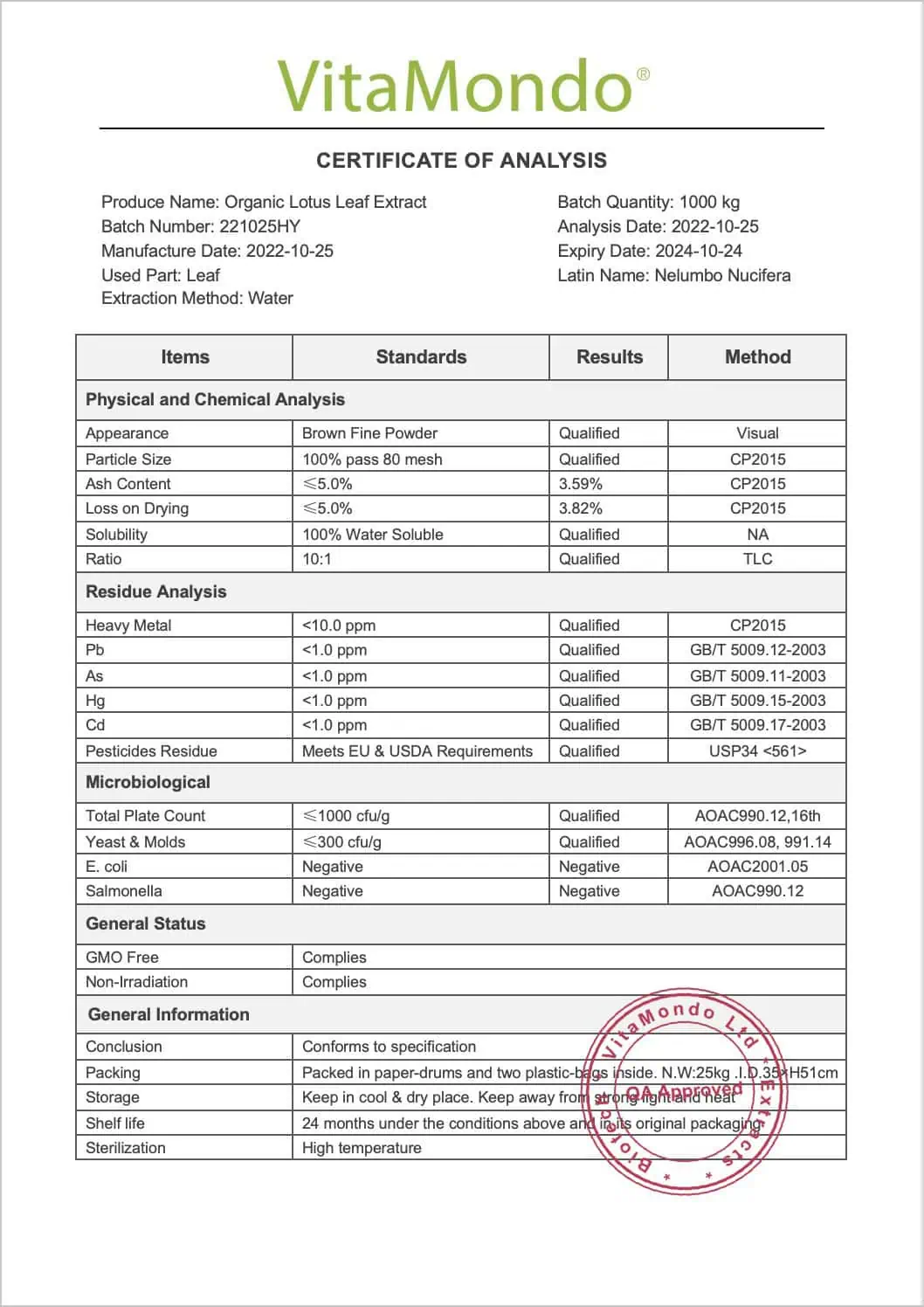Organic Lotus Leaf Extract (20:1 concentration). Standardized for Nuciferine content.