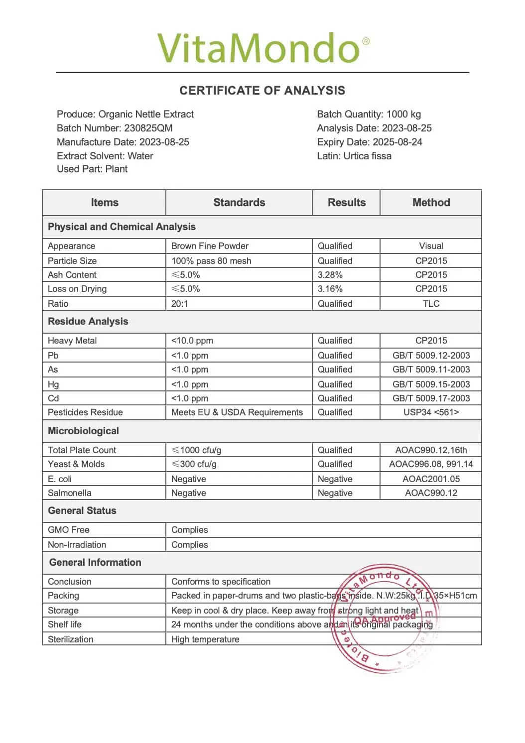 Organic Nettle Extract powder is a concentrated form of the nutrient-rich nettle plant, traditionally valued for its ability to support recovery, circulation, skin, hair, and overall vitality. Modern analysis has revealed a diverse mix of beneficial plant compounds, including amino acids, polyphenols, tannins, beta-sitosterol, phytosterols, scopoletin, steryl glucosides, phenylpropanoids, polysaccharides, and lignin – working together to promote multiple aspects of health.