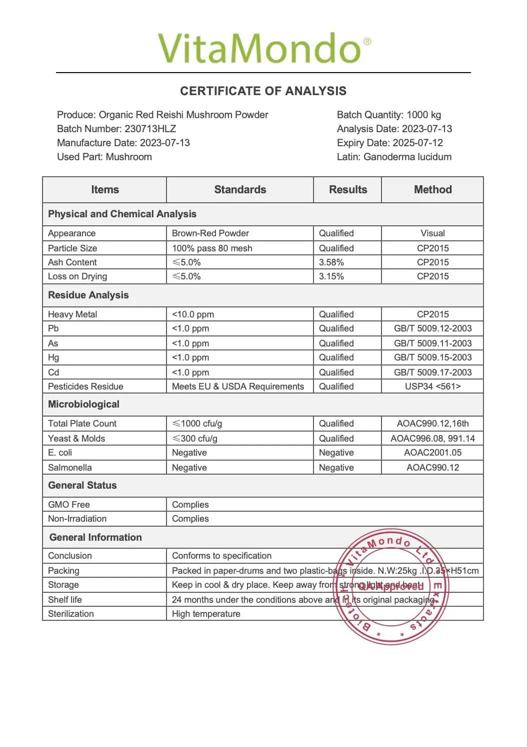 Our Organic Red Reishi Mushroom Powder is made from 100% dried fruiting body and contains naturally occurring polysaccharides, triterpenes, and other bioactive compounds. These contribute to its distinctive earthy taste and its long-standing reputation as a valued functional mushroom.