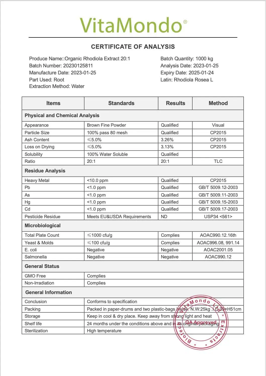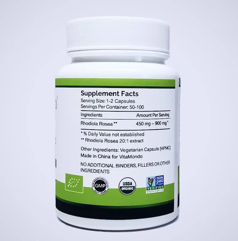 Organic Rhodiola Rosea supplement. 20:1 extract. Capsule weight: 500 mg. Vegetarian capsules made from cellulose. Vegan, Natural, and Non-GMO.