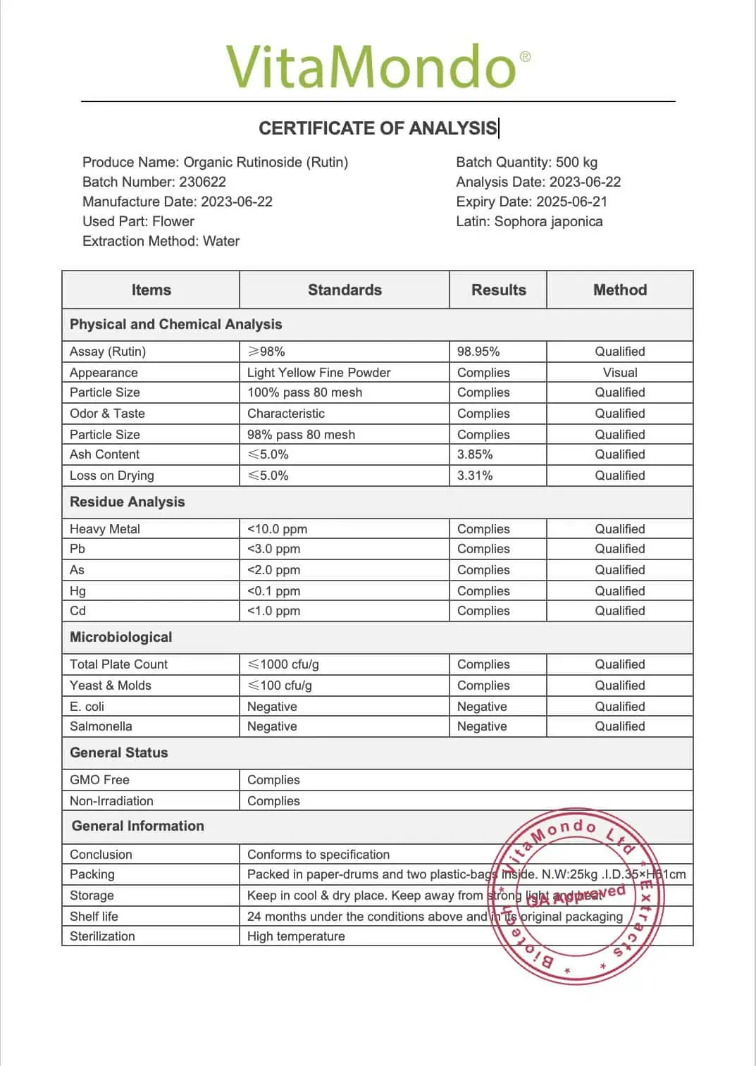 Organic Rutin Polyphenol 98% (Quercetin-3-O-Rutinoside) from Sophora japonica flower buds. Certified organic for EU and USA. Non-irradiated (NR11).