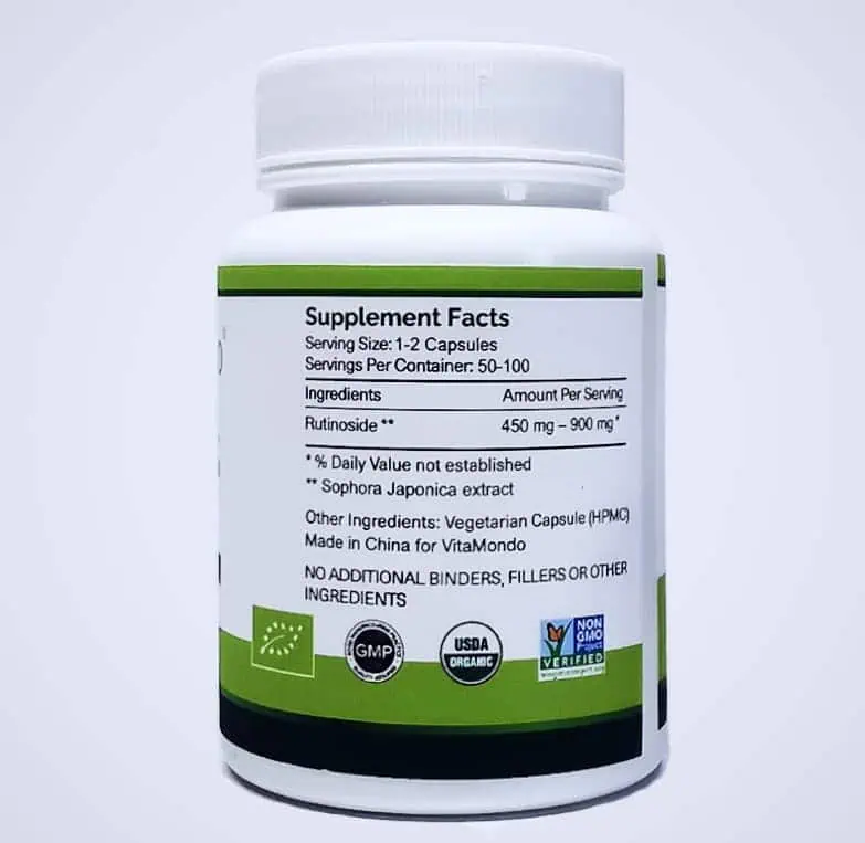 Organic Rutin Supplement 98% (Sophora japonica). Vegetarian cellulose capsule. No fillers, binders, or artificial additives.