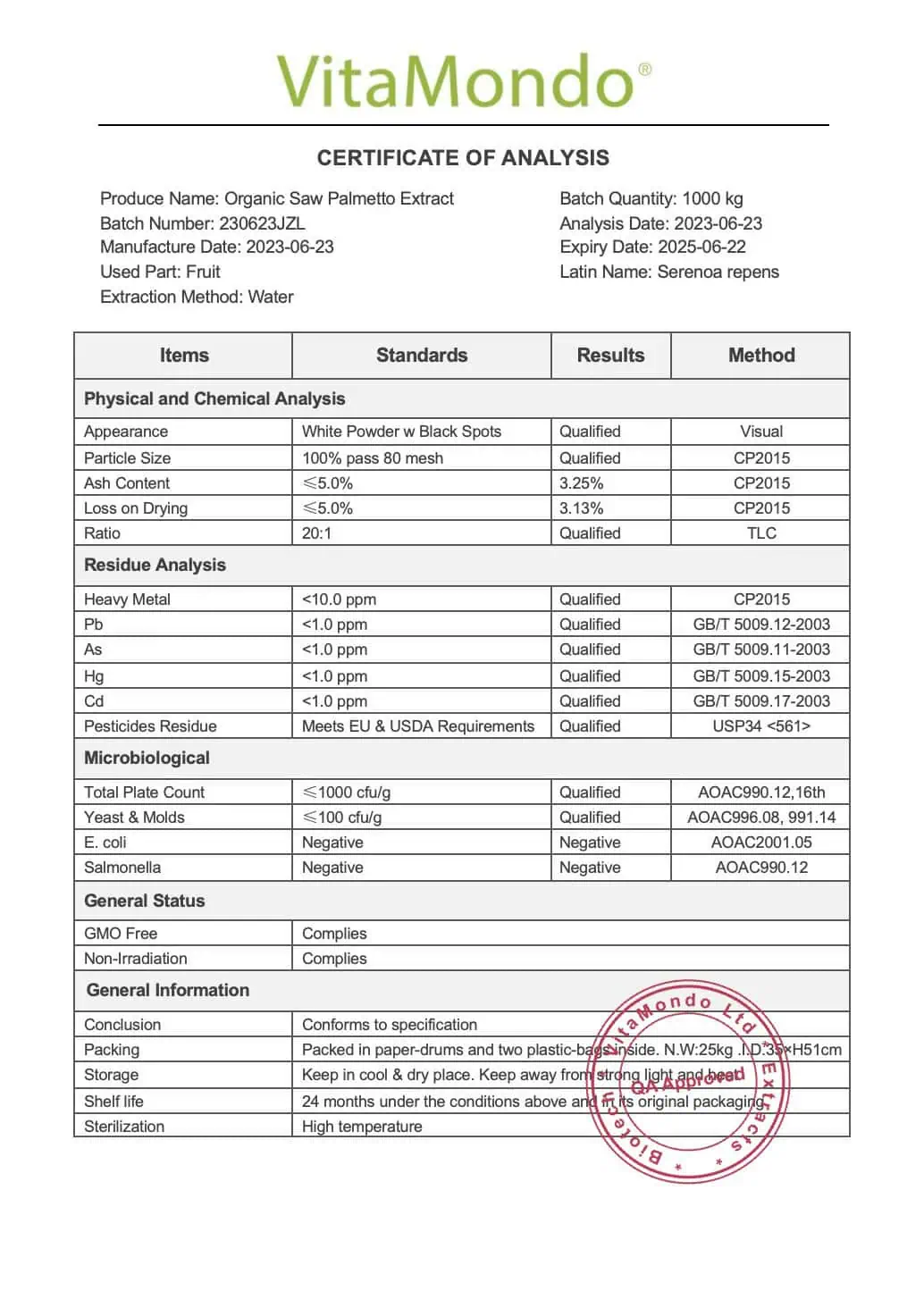 Our Organic Saw Palmetto Supplement is made from the berries of the Serenoa repens palm, traditionally valued in its native North America. The extract is produced from a 20:1 concentration of premium berries, naturally rich in fatty acids, phytosterols, and plant polyphenols.