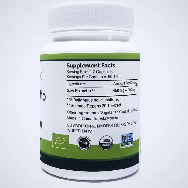 Organic Saw Palmetto Berry Extract (Serenoa repens). 20:1 Concentration. Vegetarian cellulose capsules. Contains no fillers.