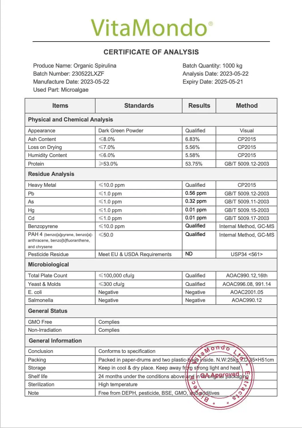 Organic Spirulina Tablets / Powder (Blue-Green Algae – Cyanobacteria). Heavy metal content tested to be below 1 ppm (typically ≤0.01 ppm).