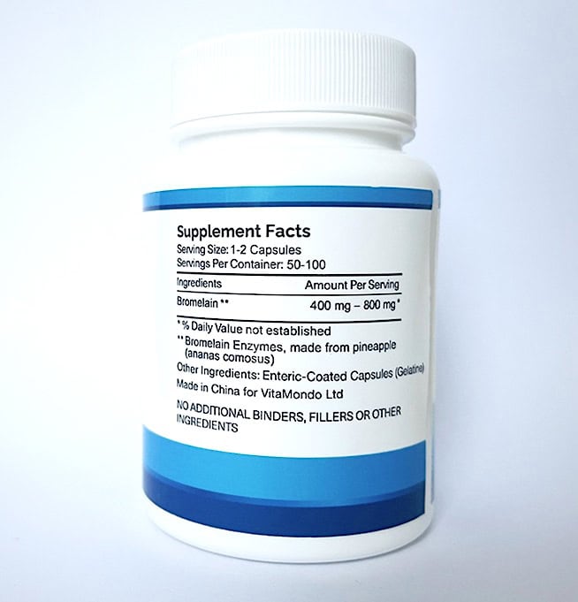 Pineapple Bromelain 2400 GDU/g (3600 MCU/g) extracted from Ananas comosus fruit stems. 400 mg enteric-coated capsules, 100 capsules per bottle.