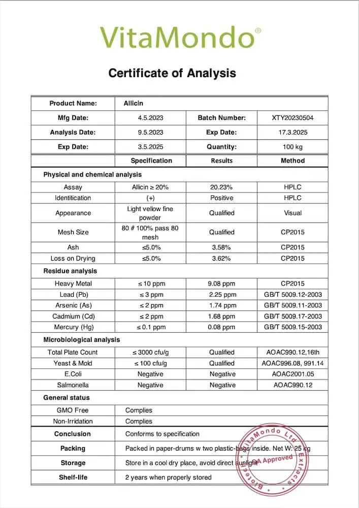 Premium Allicin 20% Supplement (diallyl thiosulfinate) from garlic extract (Allium sativum).