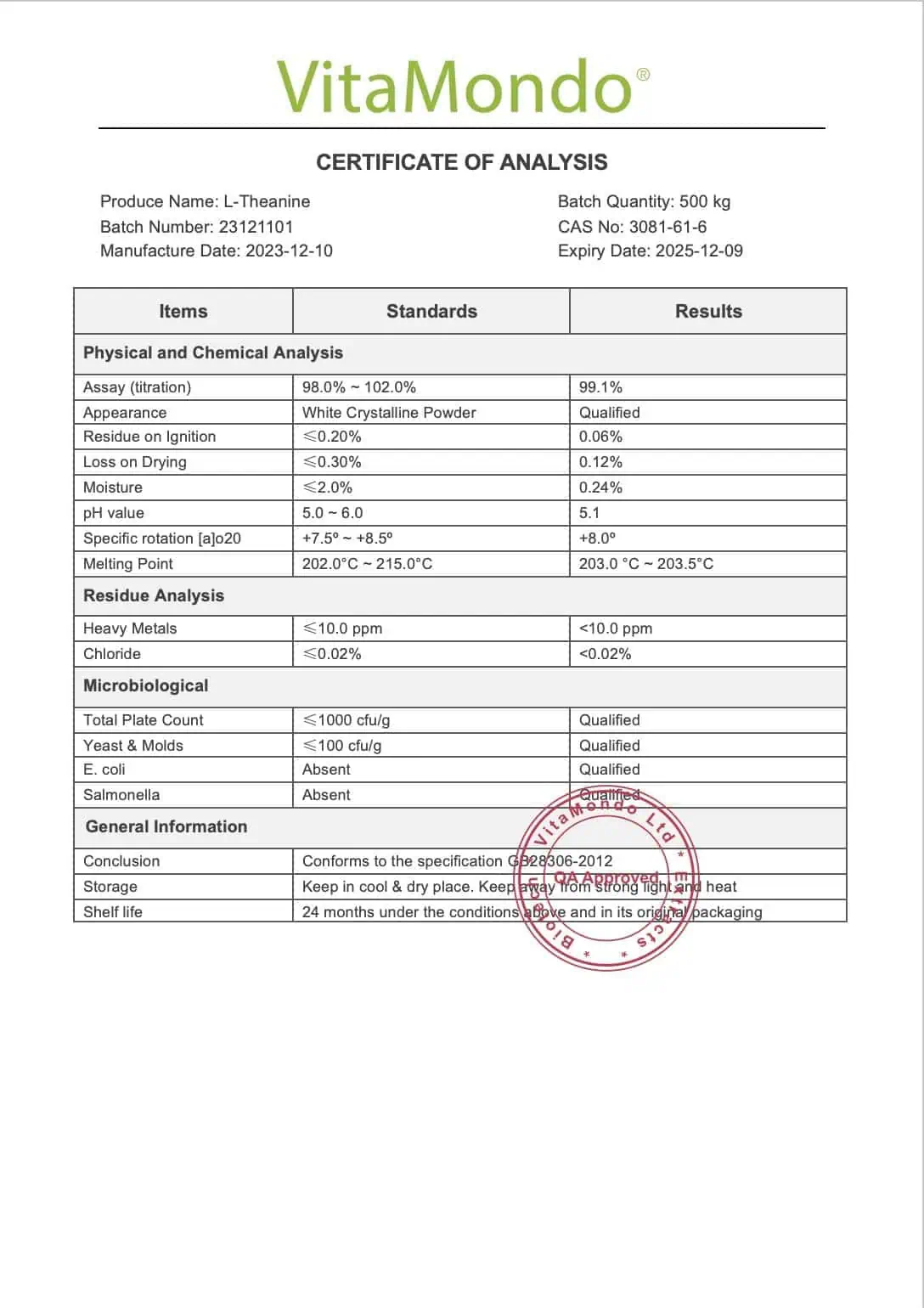 Our L-theanine is produced through enzymatic fermentation for maximum purity. (Enzymatically fermented L-theanine is not currently approved for sale in the EU.)