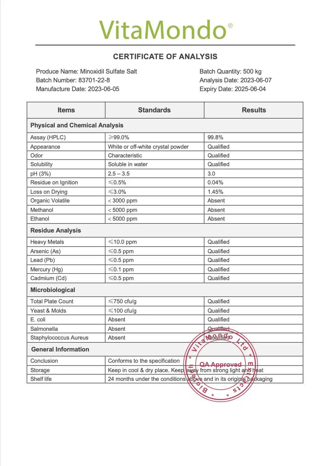 Premium Minoxidil Sulfate Salt Powder (≥99% purity).