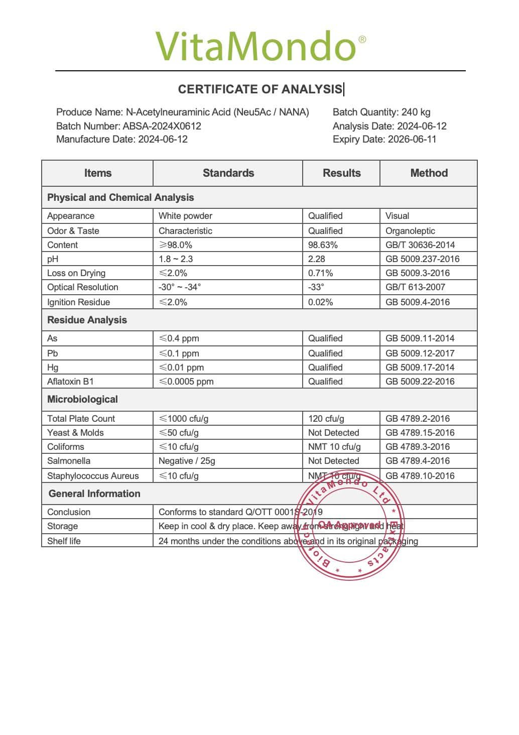 Premium N-Acetylneuraminic Acid (Neu5Ac, NANA) 25% Sialic Acid (SIA). Contains 75% mannitol (natural filler and sweetener). No other ingredients. Store in a cool, dry place.