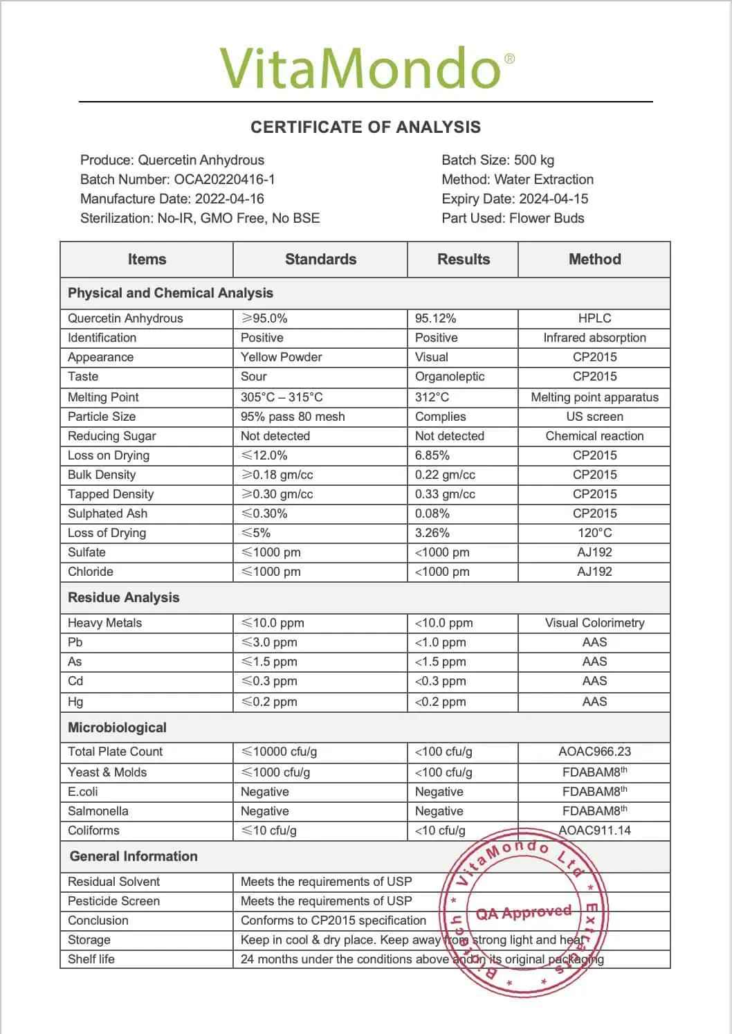 Our premium Quercetin 95% supplement pure, extracted from Sophora japonica using a water-based method and without the use of hydrochloric acid. This ensures a high-quality, neutral form of quercetin without HCL residues.