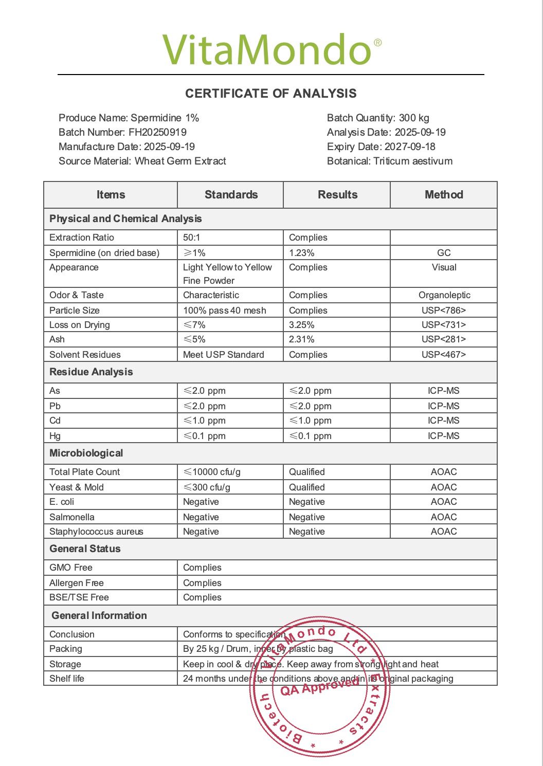 Our premium spermidine polyamine is extracted from non-GMO wheat germ (Triticum aestivum), standardised to 1% spermidine content. This plant-based extract is carefully processed under GMP conditions and tested for purity and safety, making it suitable for vegetarians.