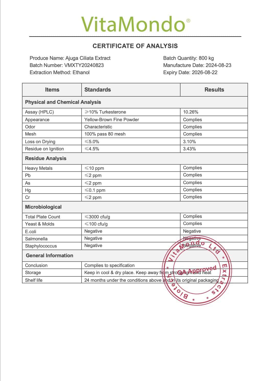 Premium turkesterone 10% is an extract from Ajuga turkestanica, a plant traditionally used in Central Asian herbal practices. It contains turkesterone, a naturally occurring ecdysteroid – a plant-based compound structurally similar to certain hormones found in insects, but without the androgenic effects of synthetic anabolic steroids.