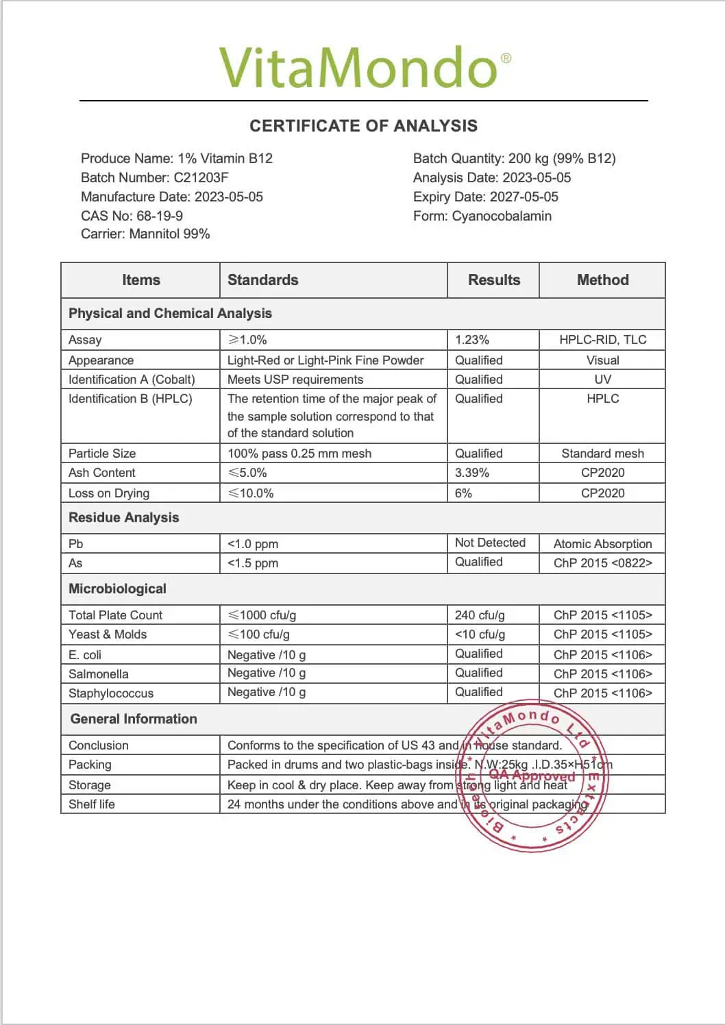 Our pure Vitamin B12 Cyanocobalamin 1% is produced from a non-animal source and is suitable for vegetarians. The cyanocobalamin form is stable and well-absorbed, converting efficiently into the biologically active forms methylcobalamin and adenosylcobalamin in the body.