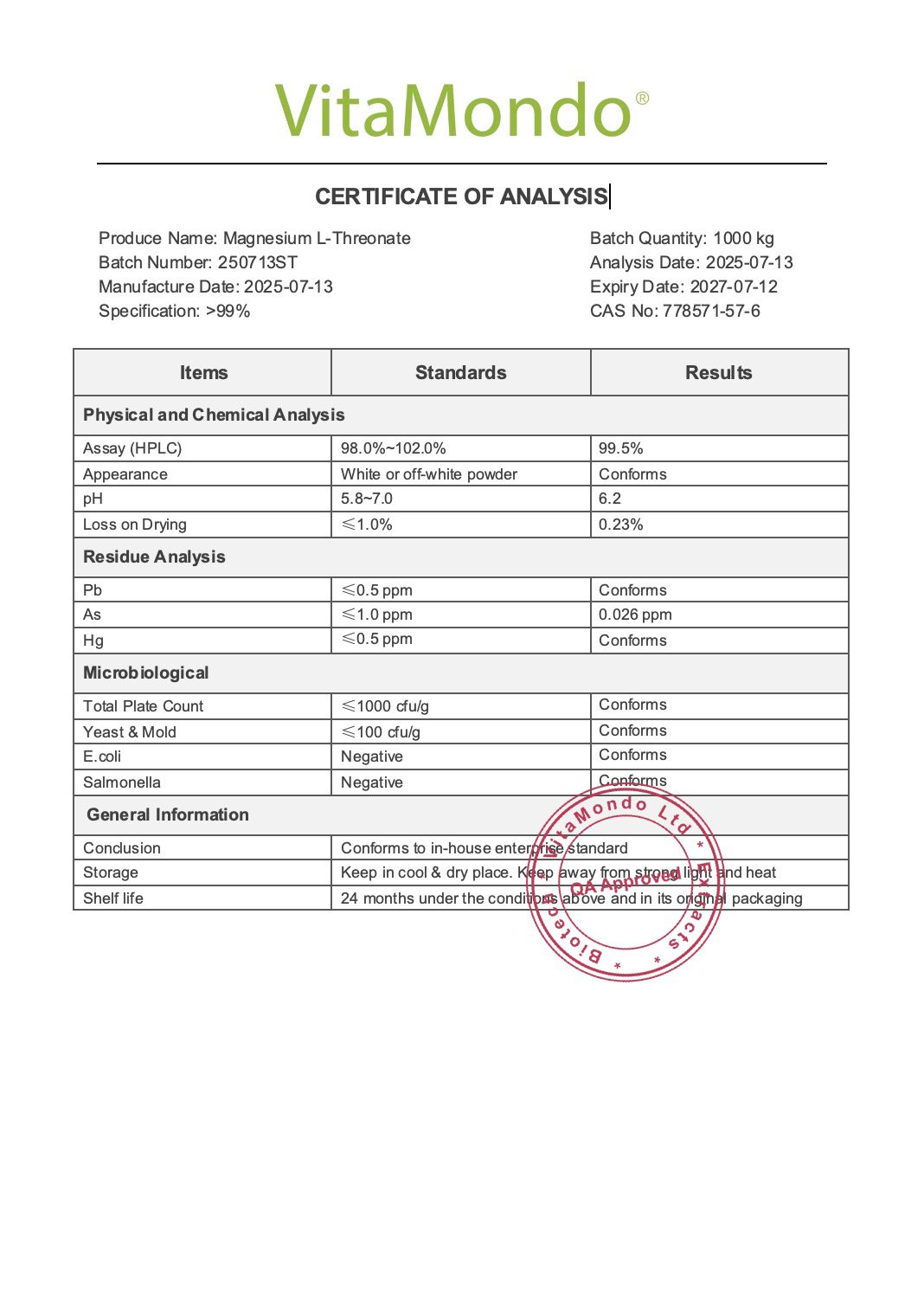 Our Premium Magnesium L-Threonate is ≥99% pure, providing a concentrated source of magnesium in a form that is well-tolerated and suitable for daily use.